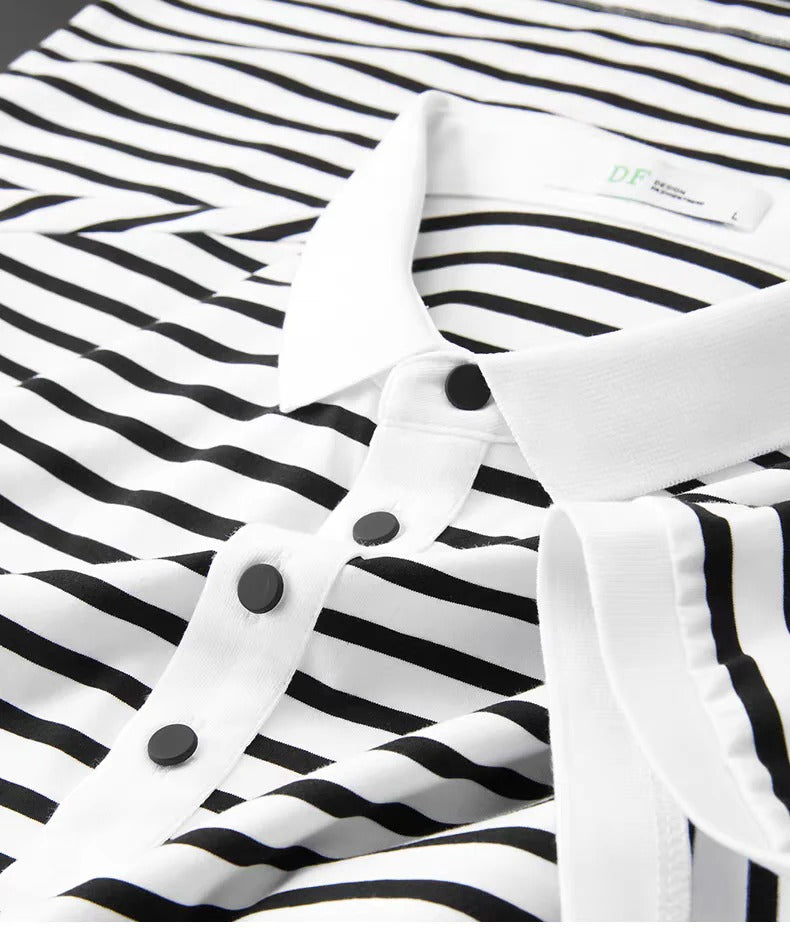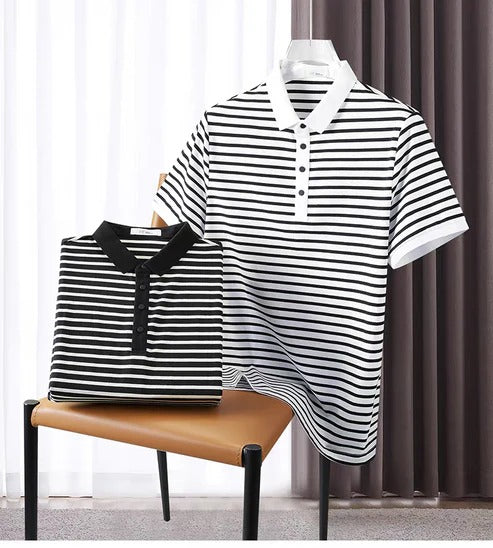Men’s Black & White Striped Polo Shirt – Classic Casual Short Sleeve Polo