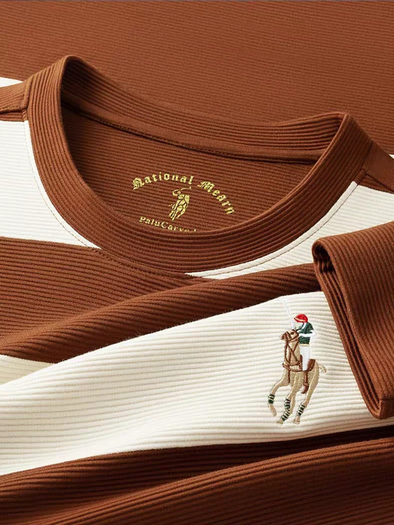 Men’s Navy & Cream Striped Long Sleeve T-Shirt – Casual Crew Neck Knit Tee